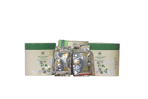 - Là sản phẩm trà xanh ướp hoa Nhài được bao gói bằng giấy bạc trọng lượng 150 gam. Đóng trong hộp thiếc bán nguyệt kiểu dáng đẹp, sang trọng .