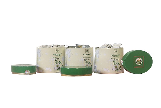 - Là sản phẩm trà xanh ướp hoa Nhài được bao gói bằng giấy bạc trọng lượng 150 gam. Đóng trong hộp thiếc bán nguyệt kiểu dáng đẹp, sang trọng .